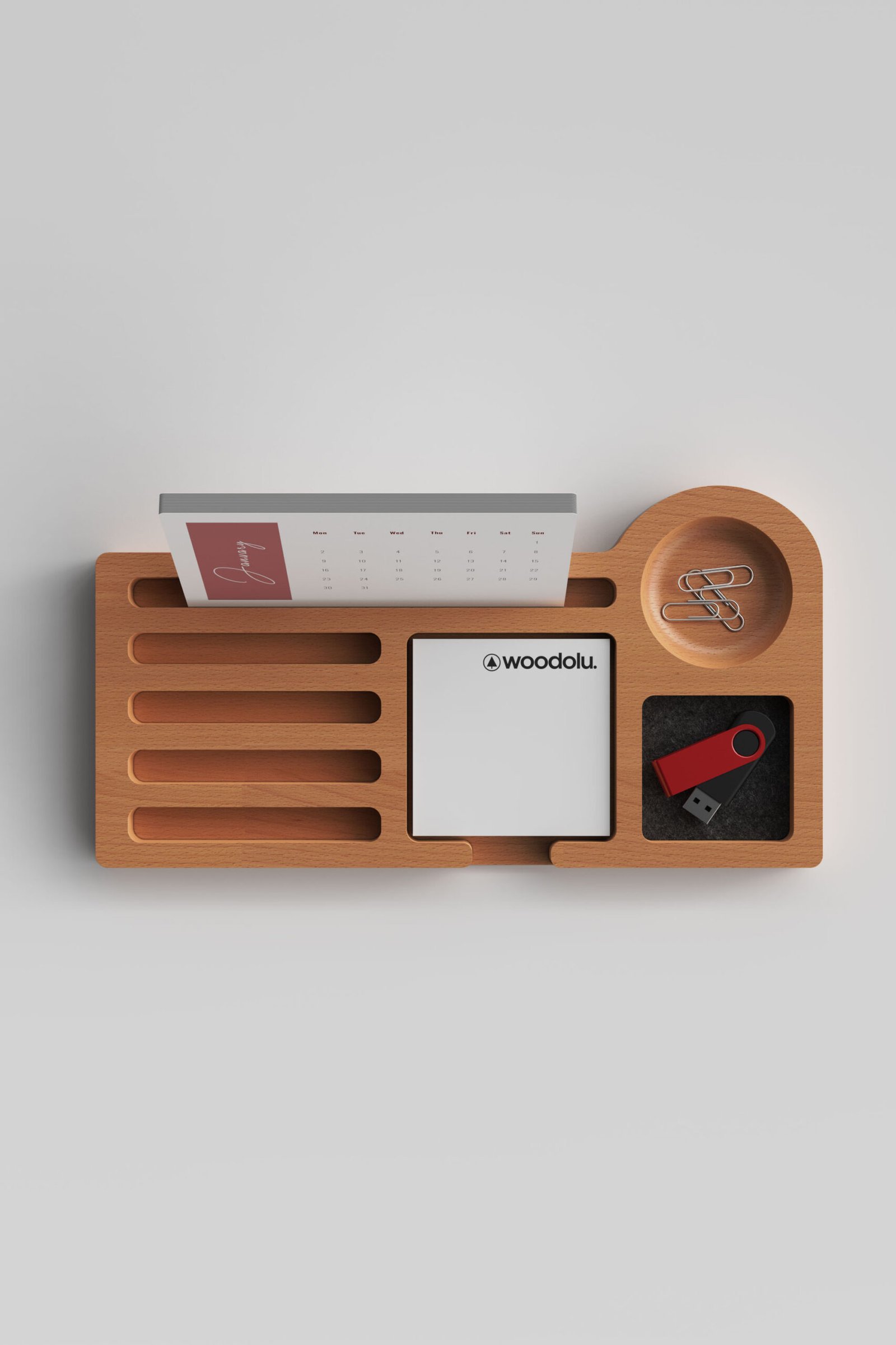 CW-23 Ahşap Masa Takvimi, 18mm kayın ağacından üretilmiş dayanıklı yapısı ve modern tasarımıyla ofis ve çalışma alanlarınıza prestij katar. 12 yaprak ve 1 kapaktan oluşan standart takvim düzeni sayesinde yıl boyunca düzenli kullanım sağlar. 4 özel bölme, not kağıdı yuvası, 2 gereçlik ve takvim yuvası ile sadece bir ahşap masa takvimi değil, aynı zamanda çok fonksiyonlu bir ofis masa düzenleyici olarak öne çıkar. Bölmeler, kartvizit, telefon veya diğer ofis materyalleri için esnek kullanım sunar.